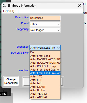 You can choose (or change) a customer's bill group during new account creation or on their Rates tab. This is a dropdown menu since one (and only one) selection must be made. By default they will appear in alphabetical order, but you can also set the order manually in order to keep all your most used bill groups together. Click and check the option Manually Sequence BG. You can then go to and pull up one of the groups you want to change. As you can see in the picture below you can then either set the group to be First in line or make it appear directly after a different group.
