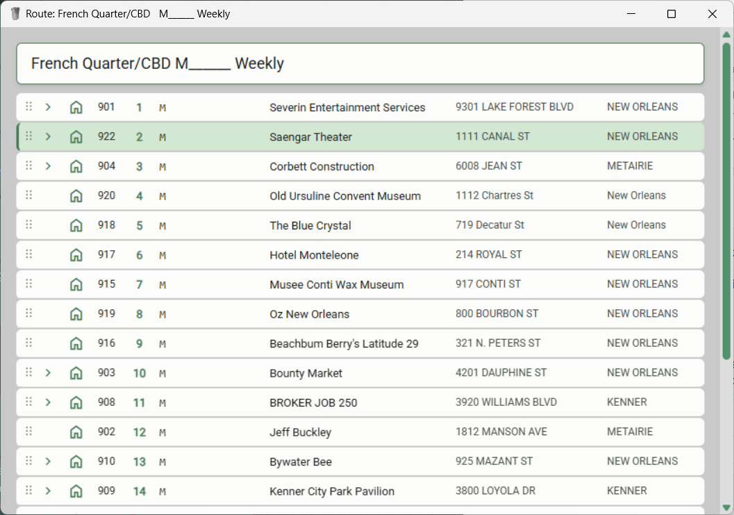 A route in Trash Flow is listed in the order of stops. The first column may show a caret (>) next to some stops; click this to expand the entry and view notes about the stop and/or containers at this location. The next column shows the Trash Flow account number. The next column is the stop number—that is, the order in which the stops will be made. There may be a column before the customer name showing what day(s) the pickup should be made. Note: If a number appears after the stop day, that number indicates the number of weeks to skip this stop for pickup. The final column displays the customer's name and address.