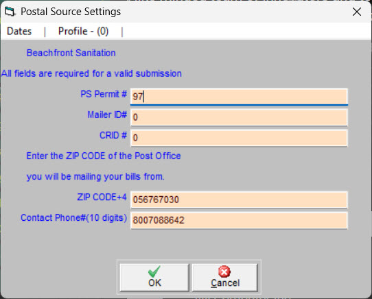You must have a version of Trash Flow that includes billing. You must have received a bulk mailing permit from your local post office; you can ask for help from the postmaster there, download and fill out PS Form 3615, Mailing Permit Application and Customer Profile, or log in to your account at the USPS Business Customer Gateway. If you have not yet created a business account you will need to do so at (https://reg.usps.com/entreg/RegistrationGatewayAction_input). Finally, you must have received your Mailer ID (MID) and Customer Record ID (CRID) from the U.S. Post Office website (https://postalpro.usps.com/node/433).