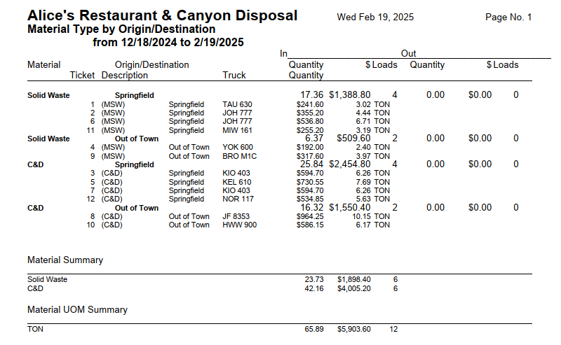 The Material Summary at bottom lists each material, the total quantity, amount charged, and number of loads for the date range. The Material UOM (unit of measure) Summary is not always needed. It lists each UOM, the quantity for all materials, amount charged, and number of loads for the date range. This is useful if you track some materials by tons and others by cubic yards, pounds, etc.