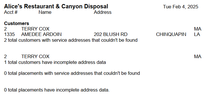 When a Trash Flow technician first puts in the license for AVS the program will go through every physical address and container placement in the system. Trash Flow checks our existing records, Google Maps, and Open Street Maps to locate each customer on a map. This report lists addresses where this geocoding didn't work.