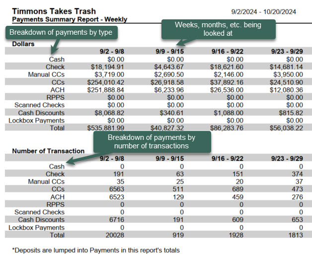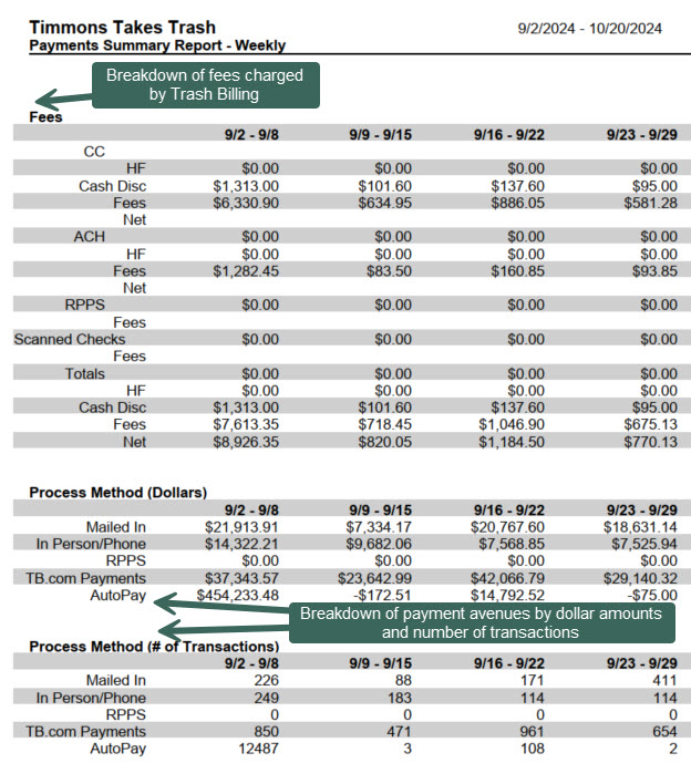 There’s more information available for electronic payments. The second page starts with how much Trash Flow has taken out in processing fees and gives the net of how much your business was charged. It also breaks down transactions by "payment avenues," information about how the payment got recorded in Trash Flow.