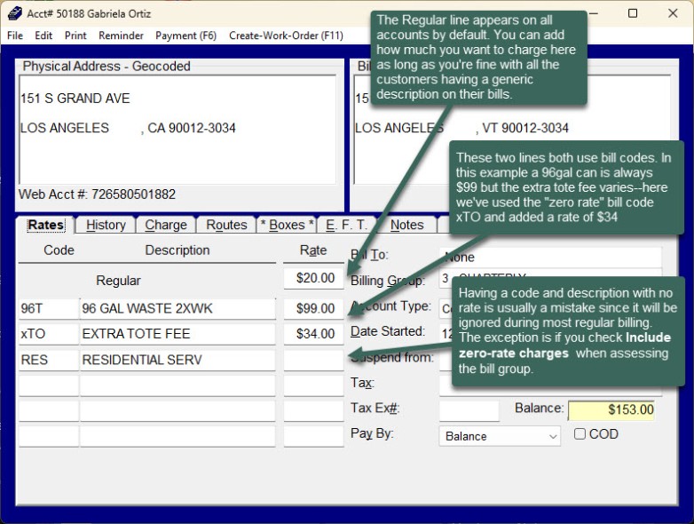 This page explains how to add or change a customer's rate for regular, recurring trash service. (If you need to make one-time charge to a single customer see instructions here.) Any charges set up on the Rates tab will be charged to the customer when you assess regular charges as part of your billing.