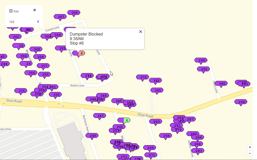Every stop will show a flag. If it's one solid color, matching the name of the route in the key, the driver has not recorded any stop activity yet. If the right half of the pin is green it means the stop was picked up; red means Trash Not Out or Bin Blocked. Clicking on any flag will display the activity, timestamp, and stop number.