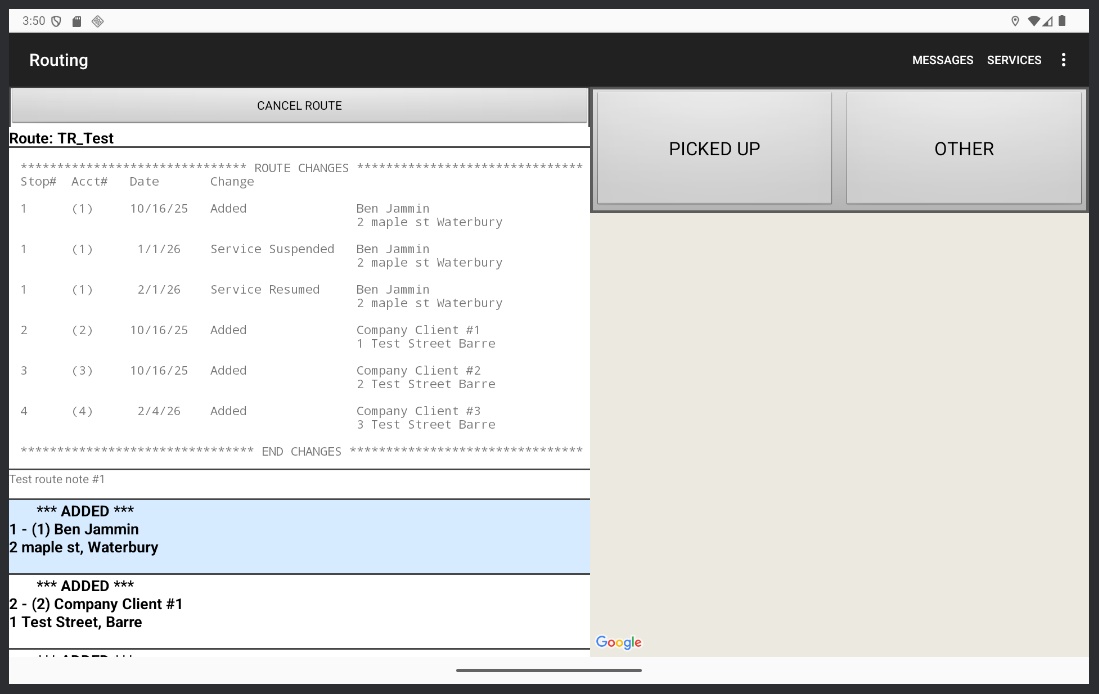 Go to across the top to send a message to the office or re-read any messages they’ve sent you. When you receive a message it will automatically pop up on your screen and give you the opportunity to respond. Tap across the top to see a map of the route; each stop will be shown as a pin on the map. Go to (also across the top) to record other events besides picking up stops.