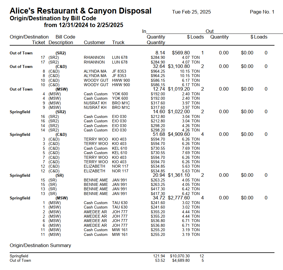 This report is sorted first by origin/destination, then by bill code. It lists the origin/destination, bill code, quantity, amount charged, and number of loads across the date range. The report then moves on to the next bill code used for loads from that origin/destination. Once all bill codes are done the report repeats the process with the next origin/destination.