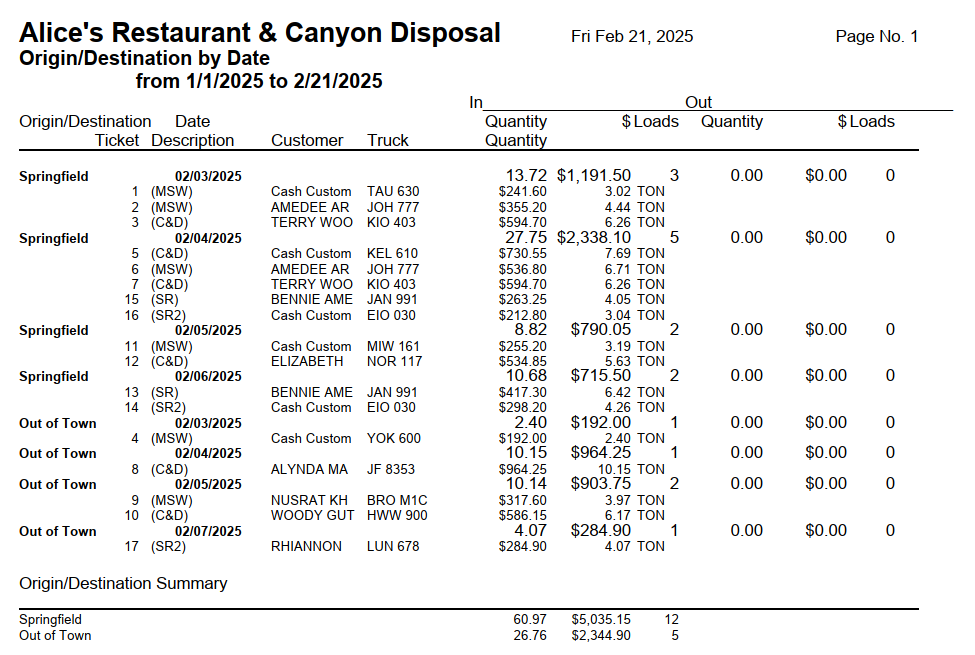 This report is sorted first by Origin/Destination, then by date. It lists the Origin/Destination, date, quantity of material, amount charged, and number of loads for each date in the report’s range. The report also provides the total quantity, dollar amount charged, and number of loads for each origin/destination across the report’s date range. If you choose to list detailed charges, the report will also list the ticket number, bill code, customer, truck, amount charged, and quantity of each tip.