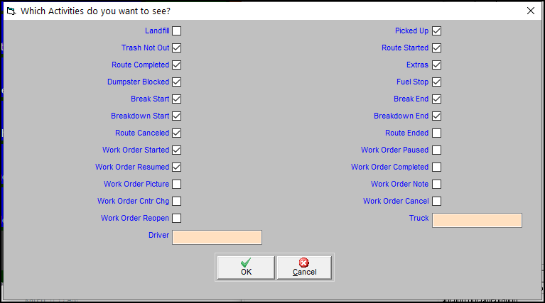 This feature is not used often, but it provides a way for users to see running updates on what drivers are doing throughout the day. This is not the same thing as exception processing (though the two are related). Exceptions are specific activities that you want to see and deal with as they happen throughout the day. The activity feed is more customizable and does not require the user to take any action—it's meant for things like "I see that Marcus is picking up residential trash on 3rd Street now" or "Truck 2 just started that work order in Springfield." Since the feed is text only it doesn't place as many demands on the computer as trying to keep up with all the trucks on a map.