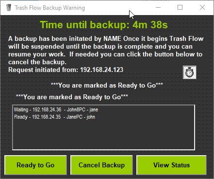 - Note: if you are the only person using Trash Flow skip to step 8). A message appears warning you that all users will be unable to work in Trash Flow until the backup is complete .
