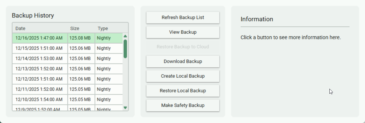All available backups are listed on the left: the date and time, size of the backup, and whether it was created automatically (every night) or manually (a user clicked the button to make a fresh backup). If you think a coworker might have made a new backup recently, especially if they work in a different office, you can click to make sure you're seeing the most recent information. As more cloud backups are saved from day to day older ones are eventually deleted automatically to make room. Safety backups and any backups made by a user are deleted from the cloud after a week (though you can always save those to your local computer if desired.) You can always access the following.