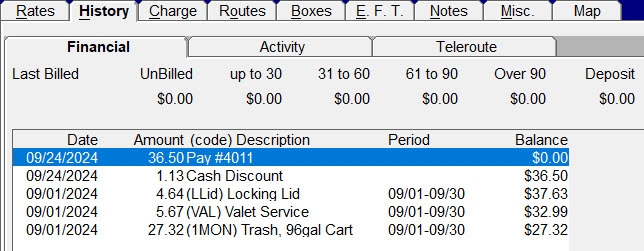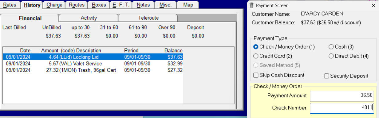 When using cash discounts you're giving customers the choice to pay the full card price with a credit/debit card or pay a smaller cash price with a check, cash, bank transfer, etc. We've tried to work these discounts into Trash Flow as seamlessly as possible. When a payment with a cash discount is entered Trash Flow will automatically add a second transaction tied to it: a negative charge labeled Cash Discount in customer history. In the example below you'll see that the customer's balance is $37.63, but Trash Flow has calculated the payment due from the customer as $36.50.