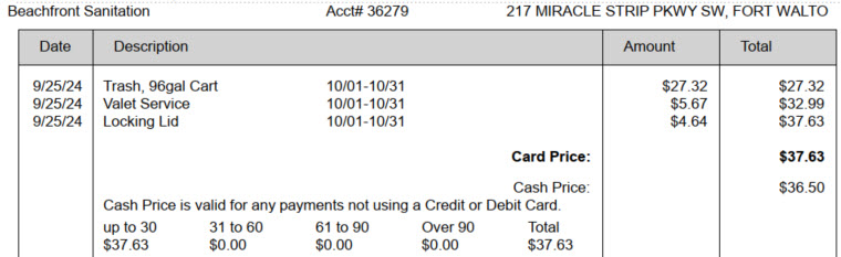 Laws vary from state to state but Visa/Mastercard prohibits merchants from adding a credit card surcharge. Some businesses add one anyway and simply hope no one notices or files an official complaint. Since Trash Billing must account for laws in all 50 states, and because trash pickup is sometimes treated as a utility (like electricity, or water/sewage), we don't have the leeway to charge customers extra for using a credit card. Cash discounts are allowed because you're charging everyone the same price but offering a discount to users who pay with something besides a card. Below is a sample statement showing the card price and cash price.