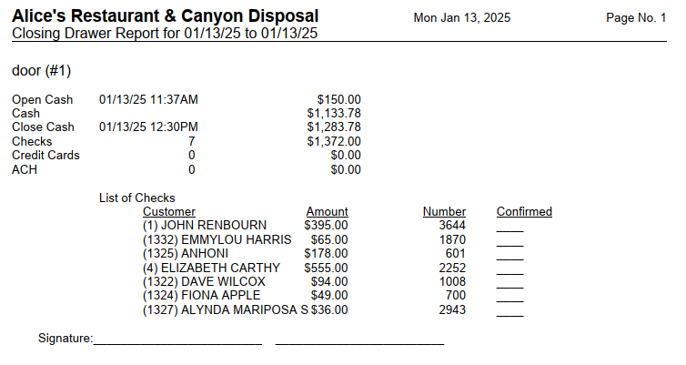 Below the drawer name the report shows the date and time the drawer was opened along with the initial cash amount entered for making change. It then shows the closing time and ending cash amount entered. Next comes a count and total dollar amount of checks, credit card payments, and ACH payments, followed finally by a list of all the individual check payments and a line for the employee's signature.