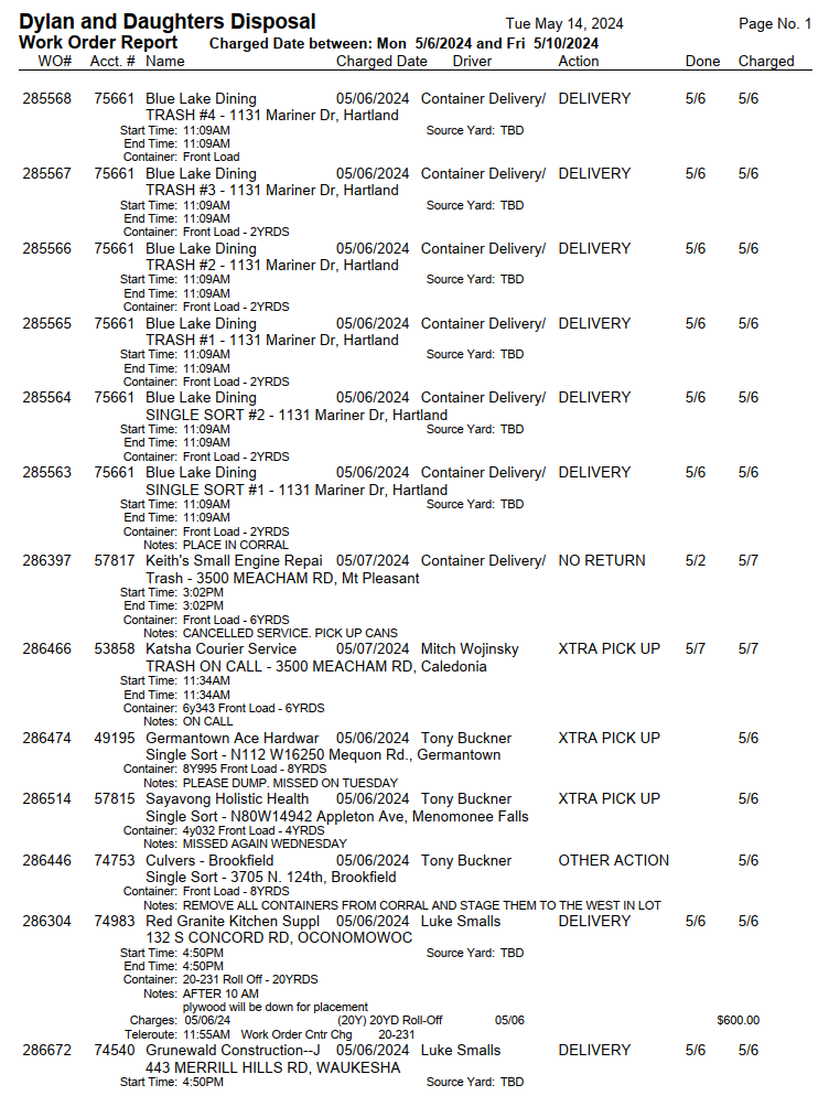 This page describes how to run a report of work orders within a given date range. This might be done to compare driver productivity, see which service areas are generating more business, confirm that the work was charged correctly, etc.