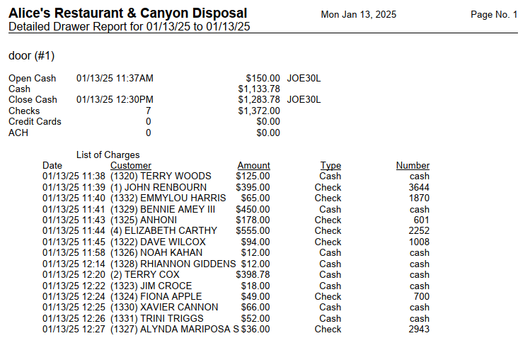 Below the drawer name the report shows the date and time the drawer was opened along with the initial cash amount entered for making change. It then shows the closing time and ending cash amount entered. Next comes a count and total dollar amount of checks, credit card payments, and ACH payments, followed finally by a list of all the individual payments (including cash).