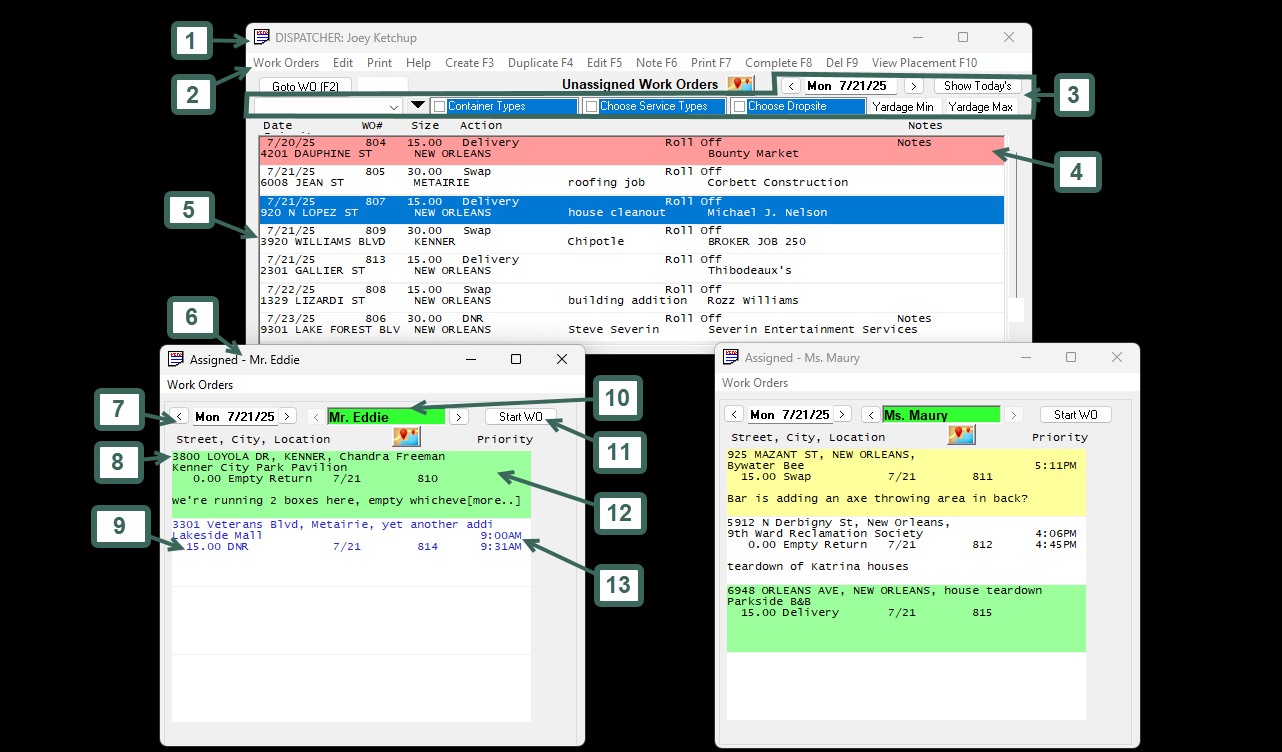 The Dispatching window is one of the more complex and involved parts of Trash Flow, largely because companies have different workflows and needs. At the most basic level clicking on the tilebar opens the Dispatch window with the list of unassigned work orders. You can then click to bring up a smaller window with a driver's name. You can click the arrows on each side of the driver's name to cycle through the list of all drivers entered in Trash Flow. Repeat that process until you have all the driver windows you want opened. Assign a work order by clicking and dragging it to a driver window or to unassigned. You can find a more detailed explanation at Assign a Work Order In the Dispatch Window. The example image below shows the Dispatch window and two driver windows, all with some work orders assigned. Explanations for each numbered item are listed below this picture.