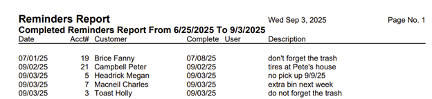 The Completed Reminders Report shows reminders that have been completed in the reminders window. This can help you organize and analyze past completed reminders without searching through the full reminders list. You can generate reports sorted by user, date range, and customer to track completed work in Trash Flow.