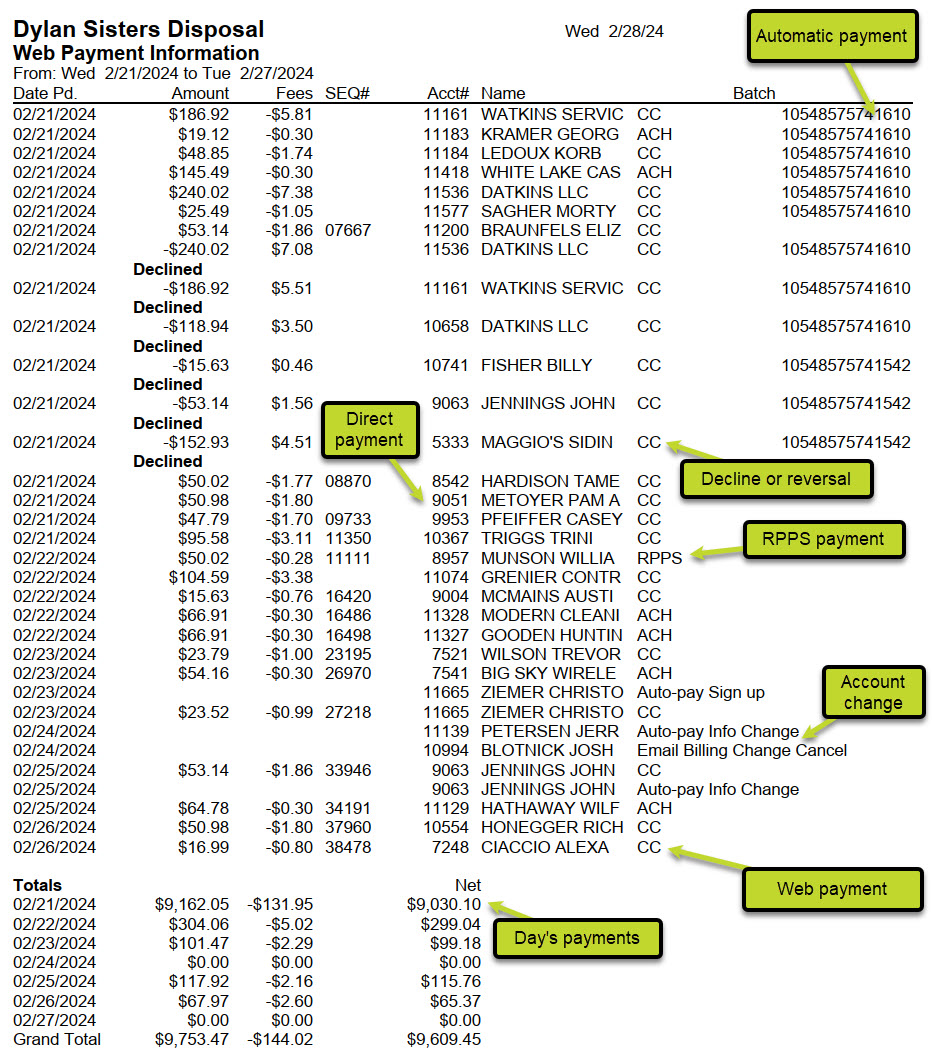 Customers who visit the TrashBilling.com website can make payments, sign up for autopay, and sign up for email billing. (They can also cancel autopay and change or remove their email address.) When you pick up web payments Trash Flow checks the website and records those transactions into customer accounts. The web payment report gives a chronological list of activities on the website within the given date range.