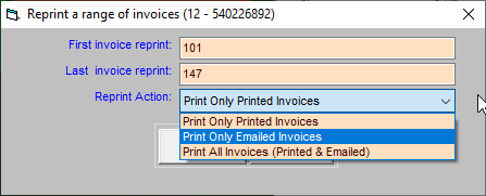 - Enter the numbers of the first and last invoices desired. The dropdown menu for Reprint Action also lets you choose whether to create printed copies of invoices that were previously emailed.