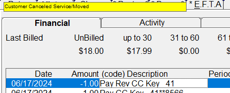 Our Trashbilling department typically sees a ~5% decline rate. Trash Flow saves the reason for declined and returned payments to customer financial history and those reasons will appear in reports. (Keep in mind that if a card gets declined on the Trashbilling.com website or in the Direct Payment window in Trash Flow it does not save anything to history and the payment attempt will not appear on the customer's card.)