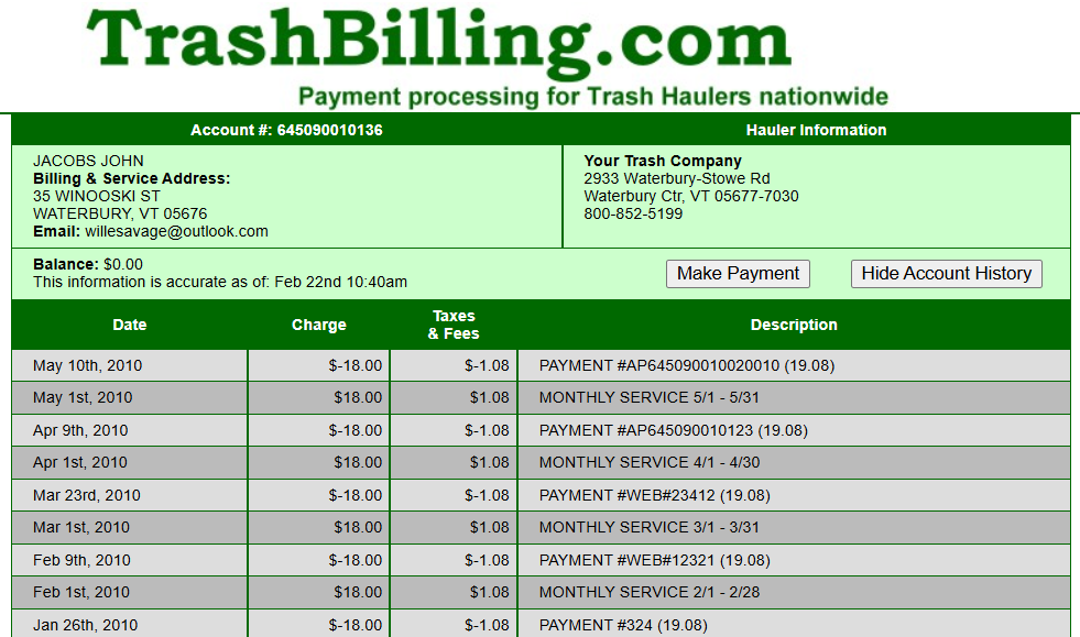 When a customer goes to Trashbilling.com and logs in with their Web Account# the website will ask them to enter the password they chose. (If it's the first time they are logging in the customer is instead prompted to create a password.) Your company information appears at the top right-hand part of the page. Most companies also choose to display account info on the web so the customer sees a box with their name, address, account number, current balance, and date of last payment. If you have chosen to display account activity on the web, customers will also be able to click View Account History to view their financial history for the last four months. Below is an example of what a customer sees at TrashBilling.com.