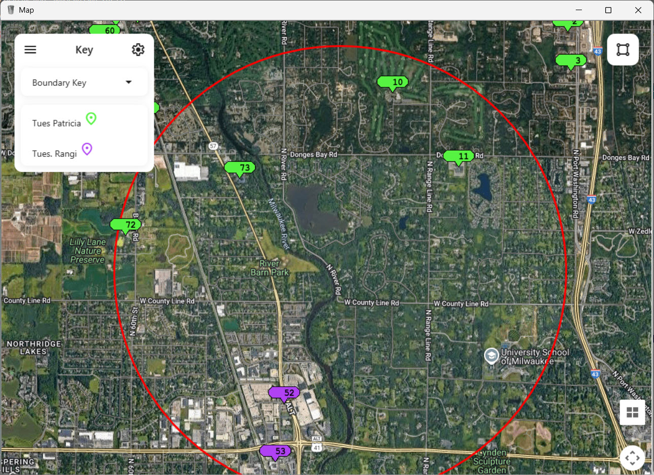 Example: We first showed the route "Tues. Rangi" on the map, then added "Tues. Patricia". The sets of markers placed on the map always go in this color order: purple, green, blue, coral, orange, red, yellow. Here Trash Flow would put the purple pins first on the route, followed by the green pins. You may wish to then sort the route by name or address after it's created.