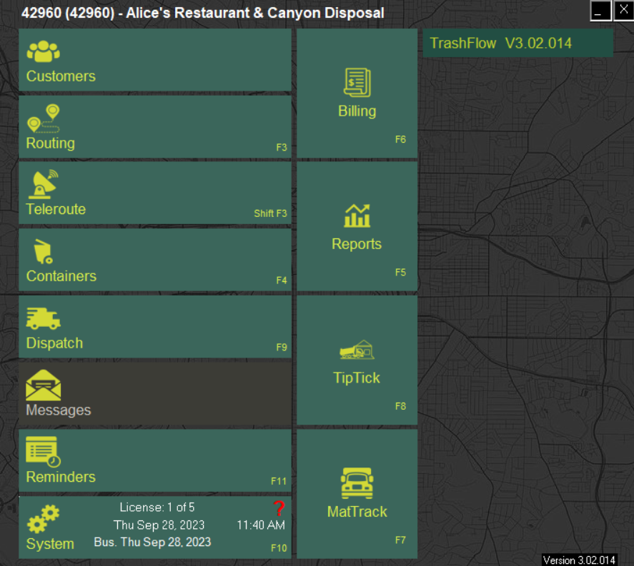 Thank you for using Trash Flow! We have been one of the leading providers of software to the waste hauling industry for over thirty years. When Trash Flow first opens you will see the "tilebar" pictured below. Customers, Reports, System, and Reminders will always be available. The other buttons depend on whether your company has purchased those particular modules of Trash Flow. Buttons for the components of Trash Flow you do not use will be dim, or "grayed out," and are not clickable.